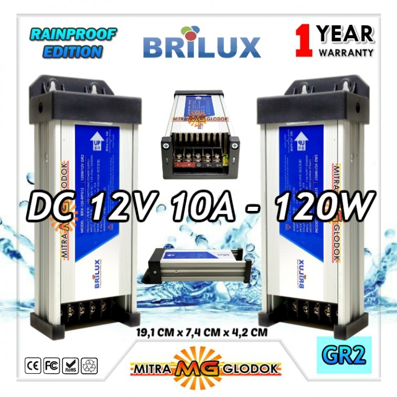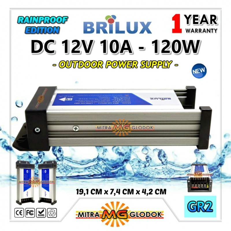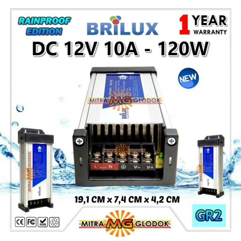 Power Supply Rainproof Outdoor 12V 120W (120 Watt) Brilux produk korea quality lengkap dengan 3 tingkat pengaman dan menggunakan IC kapasitor terbaik agar menghasilkan daya tahan lama.