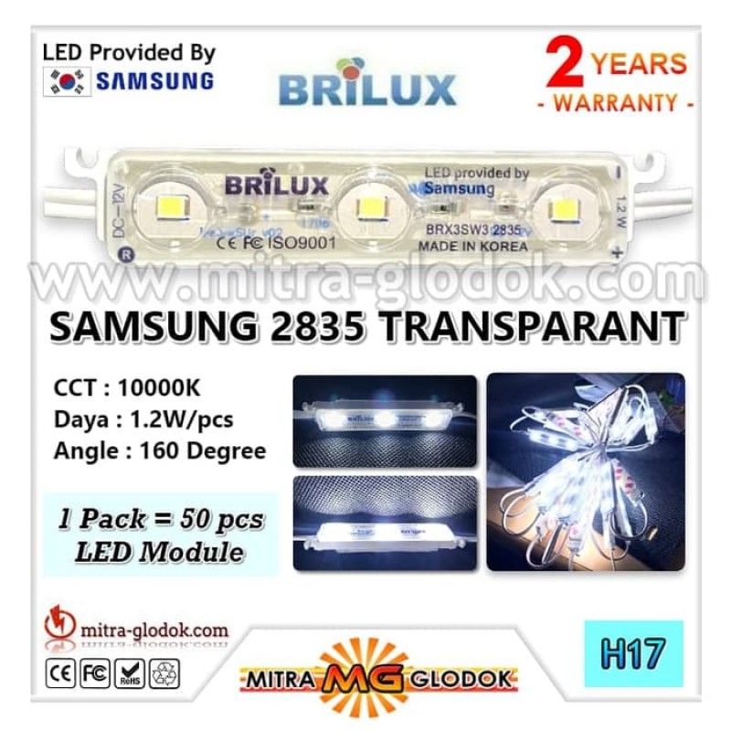 LED Module Samsung Brilux 3 Mata Samsung 2835 adalah Module Kualitas Terbaik asal negara korea "made in korea" untuk Reklame dan LED Box Ukuran Besar atau kecil dengan Garansi 2 Tahun dengan jaminan Lifetime lebih dari 50.000 Jam dan dipercaya oleh merk ternama seperti Matahari, BNI, Djarum, HItachi, Suzuki dan banyak lainnya