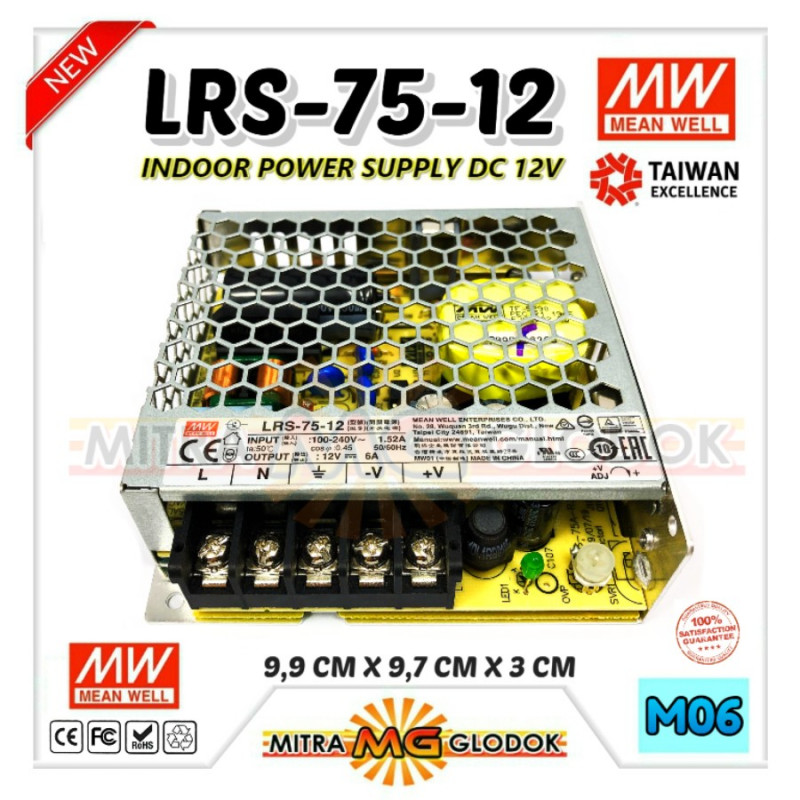 Power Supply Trafo Meanwell LRS-75-12 DC 12V 6.25A 75W | Mean Well